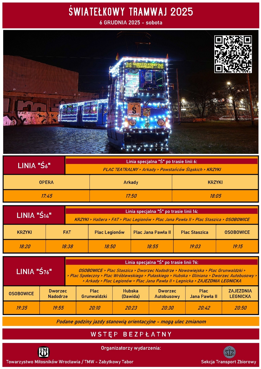 Już w sobotę 6 grudnia zapraszamy na kolejną edycję "Światełkowego Tramwaju". Po ubiegłorocznej akcji cieszącej się ogromnym zainteresowaniem nasz świąteczny tramwaj ponownie pojawi się na wrocławskich torowiskach rozświetlając ulice miasta i to dwukrotnie - 6 i 20 grudnia.