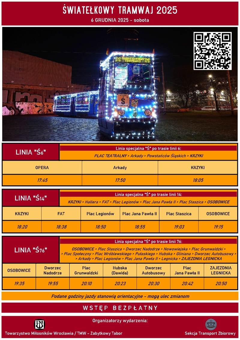 Już w sobotę 6 grudnia zapraszamy na kolejną edycję "Światełkowego Tramwaju". Po ubiegłorocznej akcji cieszącej się ogromnym zainteresowaniem nasz świąteczny tramwaj ponownie pojawi się na wrocławskich torowiskach rozświetlając ulice miasta i to dwukrotnie - 6 i 20 grudnia.