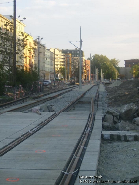 Na ul. Pułaskiego torowisko jest już prawie gotowe. Trwają prace przy nowym przystanku tramwajowym zlokalizowanym obok skrzyżowania ulic Kościuszki i Pułaskiego. Pozostała jeszcze trakcja do montażu.